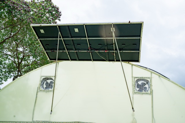 Our Eco-friendly greenhouse design maximizes natural solar energy for optimal drying conditions. This efficiency is further increased by our Heating, Ventilation, and Air Conditioning-HVAC fans and sensors which are fully powered by solar reducing energy costs and environmental impact and saving carbon emissions when compared to fuel powered drying equipment. Our smart solar dryers come complete with batteries to ensure they HVAC fans operate even at night!